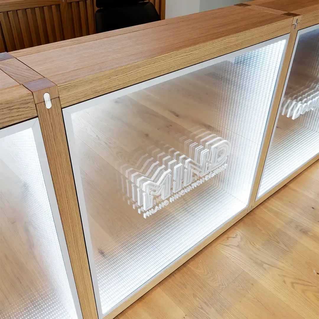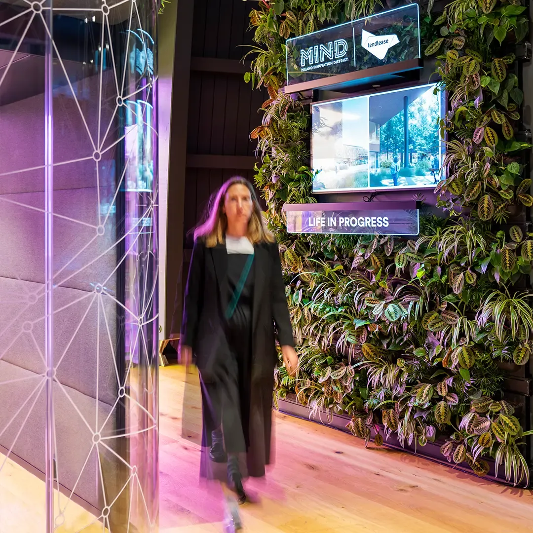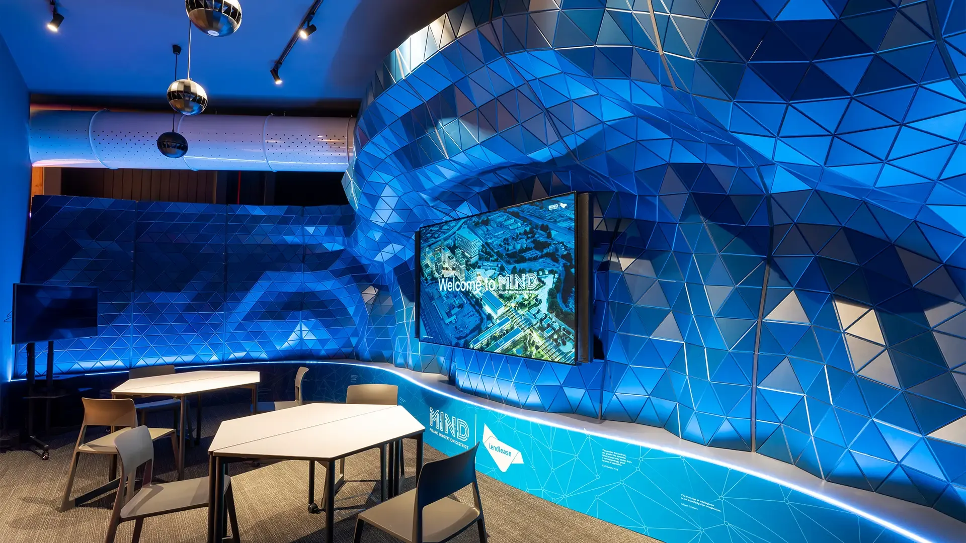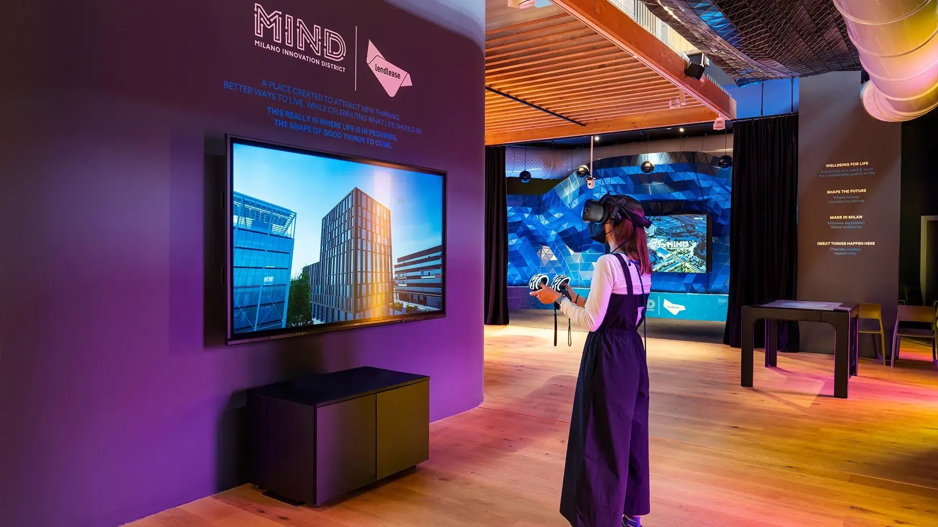 Ogni angolo della Marketing Suite è un’espressione del brand MIND: dal blu vibrante della Pitch Arena che crea un forte impatto visivo e identitario, al masterplan 3D nell’immersive area realizzato come una sorta di bacheca aggiornabile con l’avanzare del progetto, ai valori del brand integrati nel Physical Branding come un vero e proprio racconto nello spazio. Ogni dettaglio è stato pensato per comunicare i pillars progettuali e mantenere una narrazione dinamica e aggiornata. L’esperienza si sviluppa come un Customer Journey dove tecnologia e storytelling si fondono per coinvolgere e ispirare.