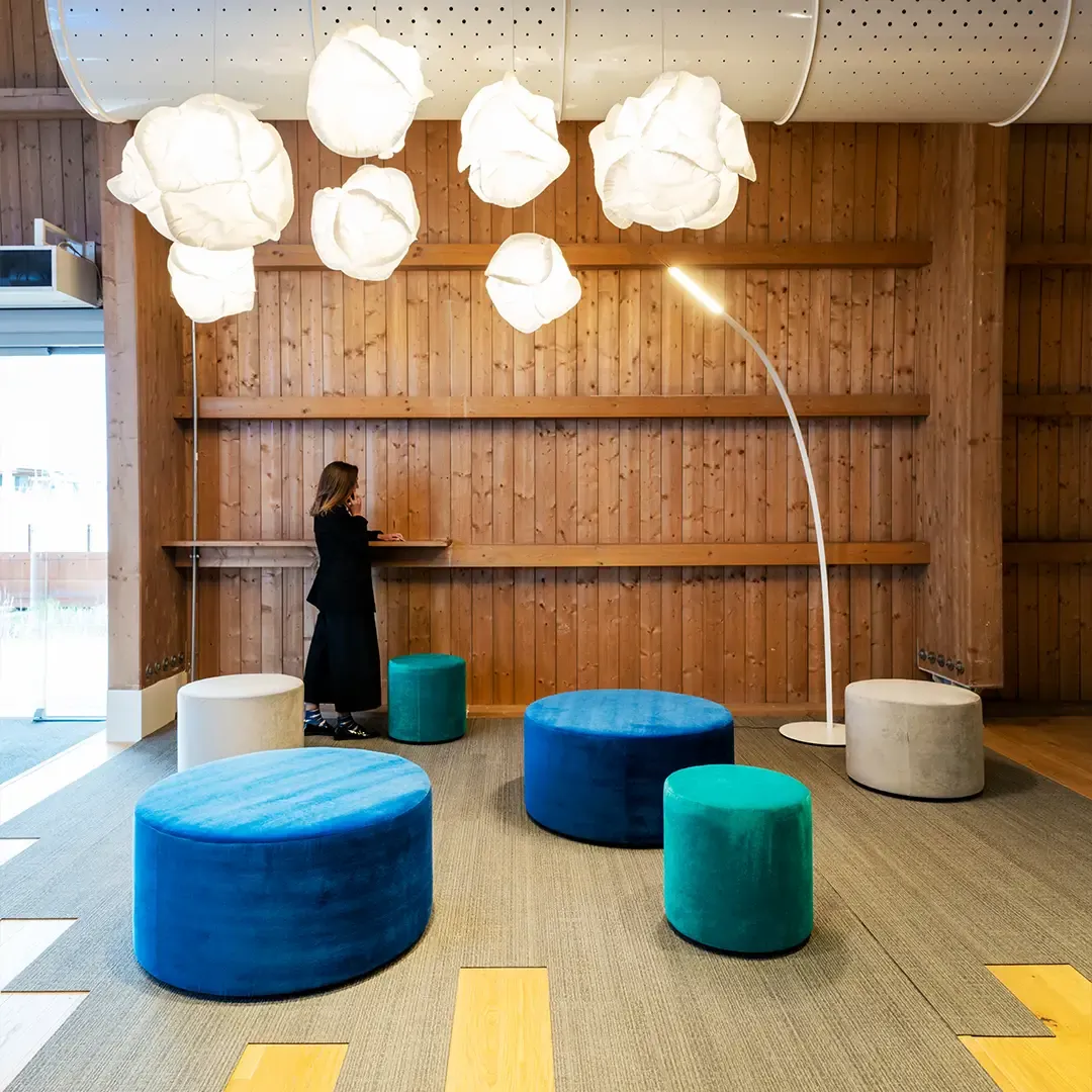 La Marketing Suite è molto più di un ambiente espositivo: è uno spazio multiesperienziale, tecnologico e flessibile. L’obiettivo è creare un racconto fluido e coinvolgente, capace di evolversi insieme al progetto stesso: l’uso del legno richiama la componente green, mentre elementi come tendaggi e layout modulari garantiscono uno spazio che si adatta alle esigenze più diverse come meeting, eventi aziendali o workshop.